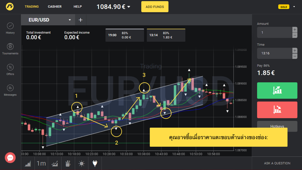 ตามกฎของกลยุทธ์ “Sliding Channels” หลังจากคุณได้ระบุค่าที่อยู่ขอบเขตนอกสุดสามค่าบนกราฟราคาและวาดช่องราคาผ่านค่าดังกล่าวแล้ว เมื่อราคาแตะกำแพงช่องไม่ว่าจะบนหรือล่าง นั่นเป็นสัญญาณให้ทำทรานแซคชันได้แล้ว