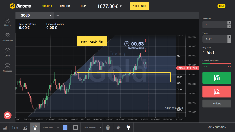 เดี๋ยวนี้เรามีจุดอ้างอิงที่แน่ชัด ในส่วนใหญ่ของกรณีจุดกลับคืนของราคาระหว่างการปรับตัว เกิดขึ้น ระหว่างระดับที่ 50% และ 61,8% เมื่อไปถึงระดับนี้แล้ว มีความเป็นไปได้สูงว่าการปรับตัวจบลงและราคากลับคืนเพื่อเคลื่อนที่ตามเทรน์ดเดิม