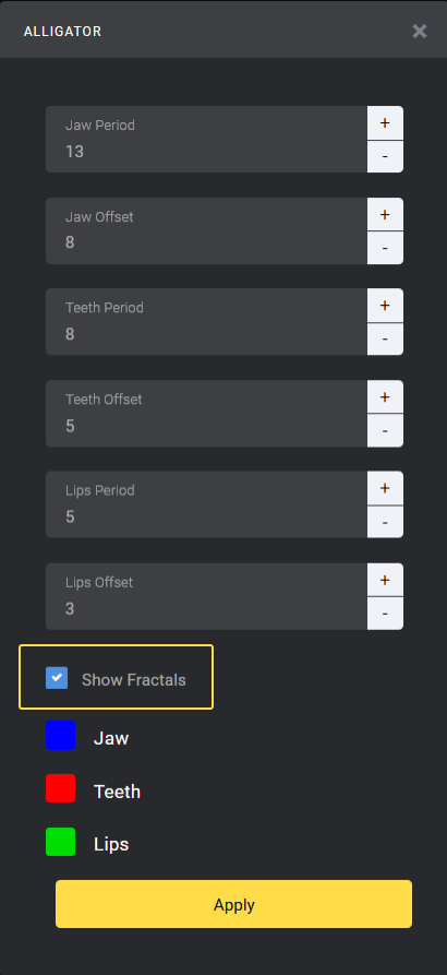 ให้เลือกตัวบ่งชี้ฟันจระเข้โดยใช้การตั้งค่าเริ่มต้นบนแพลตฟอร์ม Binomo แล้วเลือก “แสดงแฟร็กทัล”: