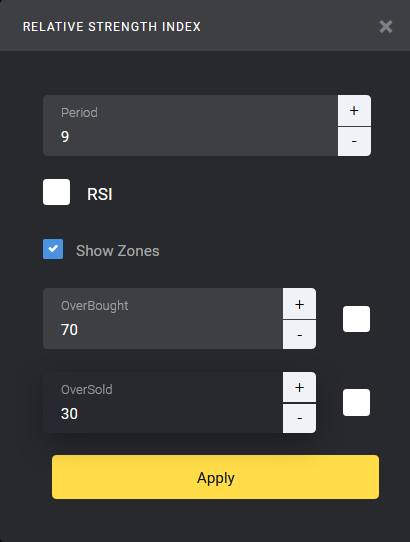 จากนั้น ให้เลือกตัวบ่งชี้ RSI และตั้งค่าพารามิเตอร์ดังต่อไปนี้: