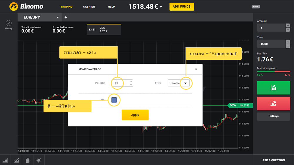 หลังจากนั้น ให้เพิ่มเติมตัวบ่งบอก «ค่าเฉลี่ยเคลื่อนที่» อีกตัวหนึ่ง แล้วเปลี่ยนพารามิเตอร์ให้เป็นดังต่อไปนี้