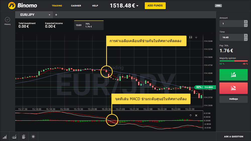 เมื่อสัญญาณของตัวบ่งบอกเหล่านี้ปรากฎตัวบนกราฟการเสนอราคา ตอนที่มีการเปิดแท่งเทียนราคา (pricing candlestick) ใหม่ ให้ท่านทำสัญญาการลดราคาสินทรัพย์ลง