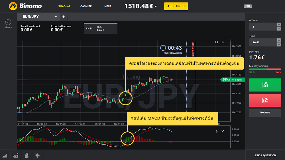 - ในตัวบ่งบอก MACD เส้นสัญญาณสีดำข้ามเส้น 0 ในทิศทางที่สูงขึ้น