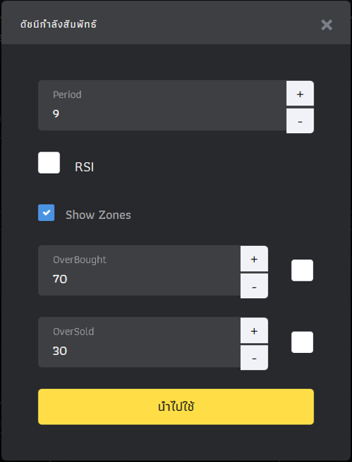 จากนั้นเลือก RSI (Relative Strength Index) ซึ่งจะระบุจุดพลิกกลับของราคา ตั้งค่าดังนี้: