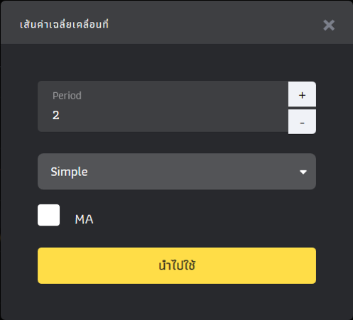 เพิ่มตัวชี้วัดค่าเฉลี่ยที่ผันแปร ตัวชี้วัดจะกำหนดเทรนด์ปัจจุบัน (ระยะสั้น) และจากทิศทางนี้ มันจะเข้าไปยังธุรกรรมที่ได้รับการแนะนำ เราตั้งค่าดังนี้: