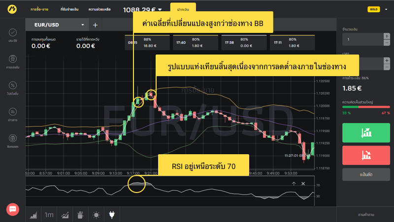 - เส้นที่ RSI ตัดกับระดับ 70 ขึ้นไป