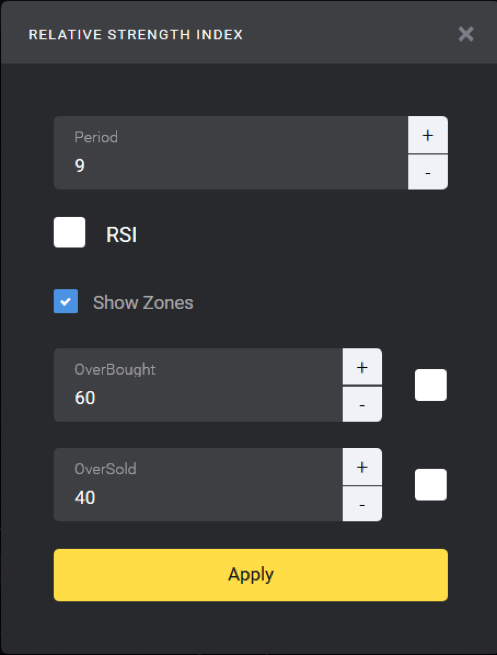 RSI (Relative Strength Index) ซึ่งจะแสดงให้คุณเห็นถึงระดับมูลค่าสูงสุดที่เพิ่มขึ้นหรือลดลง ตั้งช่วงไว้ที่ 9 และตั้งระดับที่ค่า 60 และ 40: