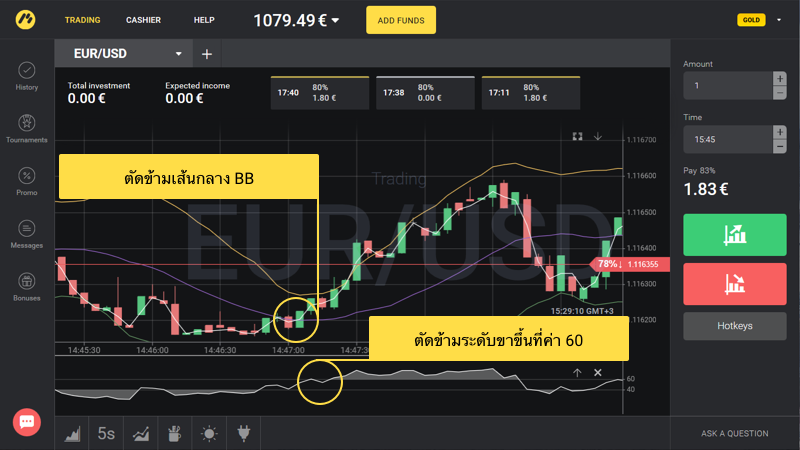 - เส้นค่าเฉลี่ยตัดข้ามเส้น Bollinger กลางที่พุ่งขึ้น (กราฟแท่งเทียนควรปิดตัวที่ระดับเหนือเส้นกลาง BB) ซึ่งบ่งชี้ถึงคลื่นแนวโน้มหุ้นขาขึ้น