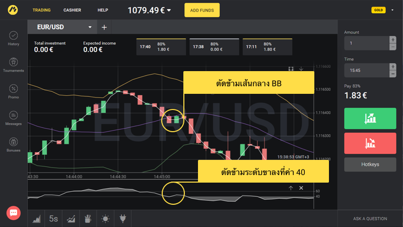 - เส้นค่าเฉลี่ยตัดข้ามเส้น Bollinger กลางที่ดิ่งลง (กราฟแท่งเทียนควรปิดตัวที่ระดับต่ำกว่าเส้นกลาง BB) ซึ่งบ่งชี้ถึงคลื่นแนวโน้มหุ้นขาลง