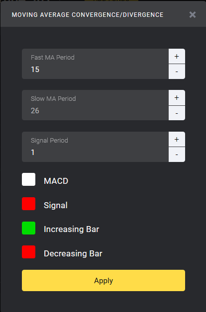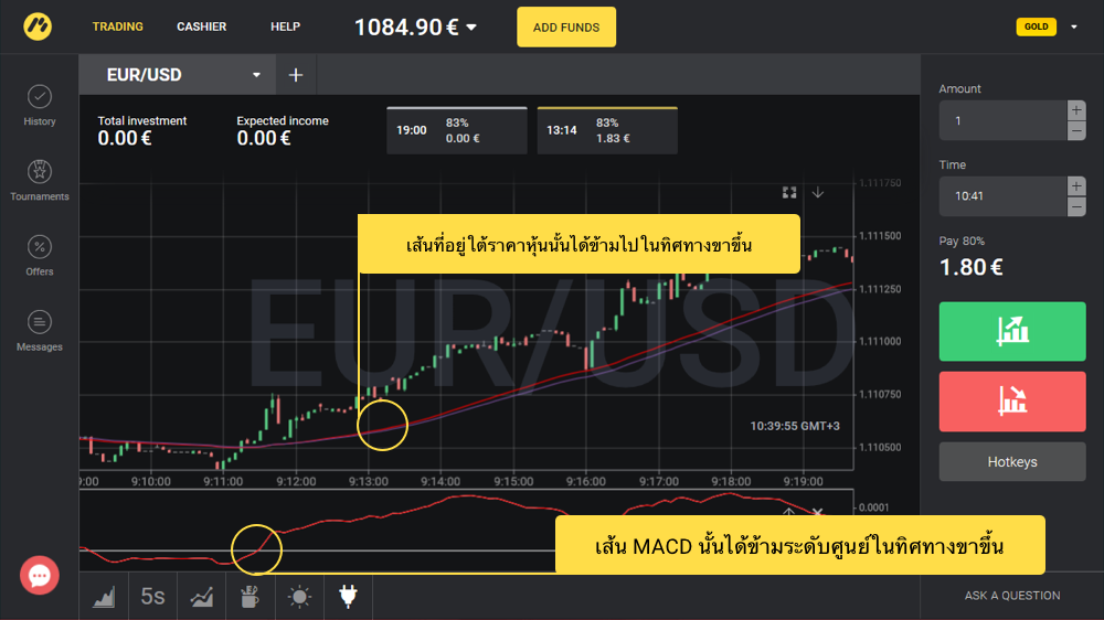 เปิดแพลตฟอร์ม Binomo และเลือกตัวบ่งชี้ MACD ที่มุมล่างซ้าย: