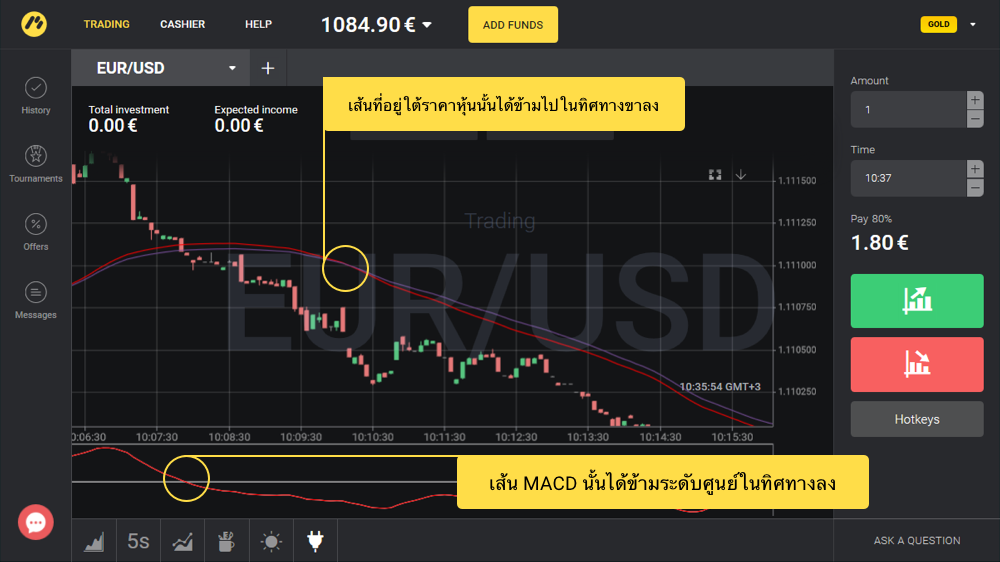 - เส้น MACD นั้นได้ข้ามระดับศูนย์ในทิศทางลง