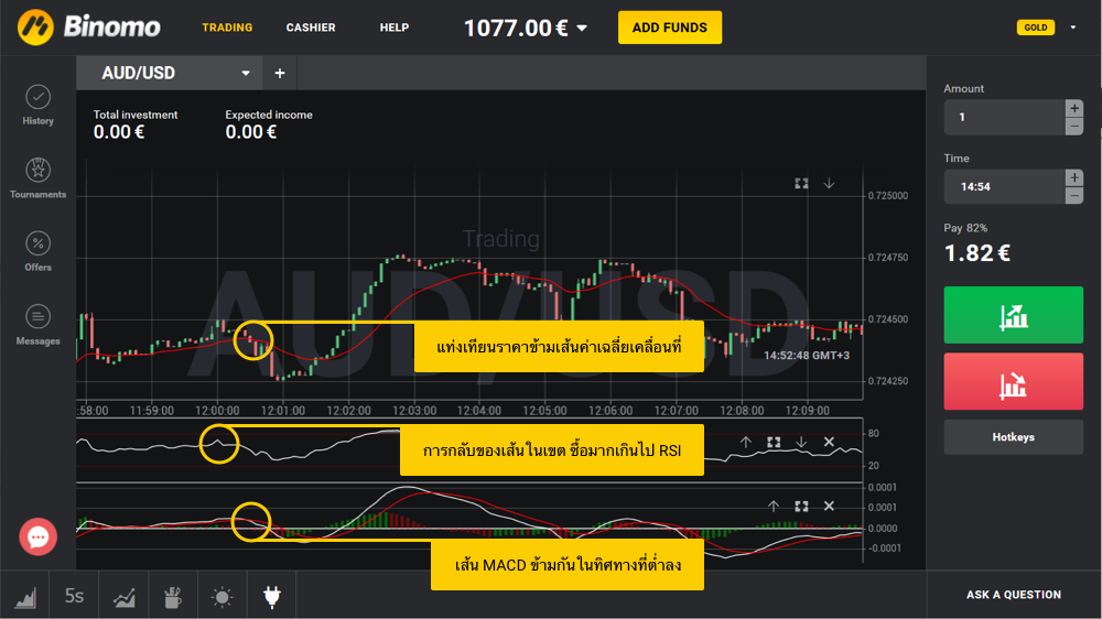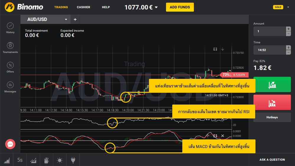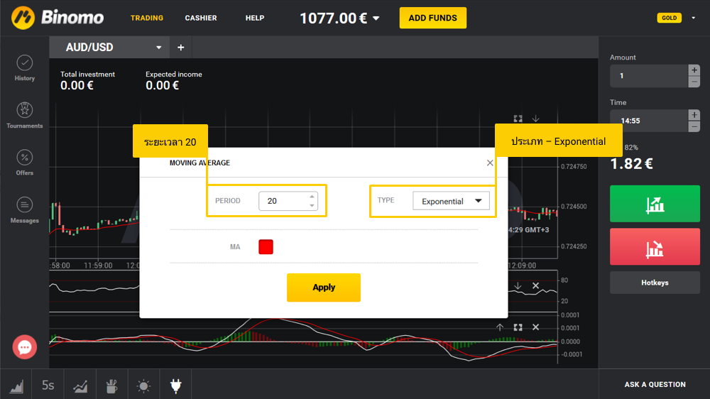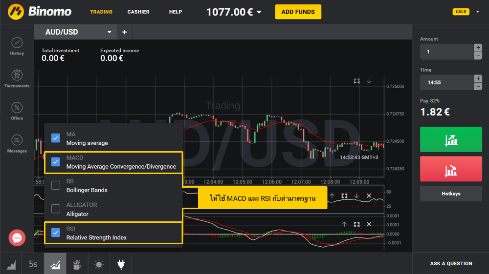 ให้กดปุ่มในมุมซ้ายมือข้างล่างของแพลตฟอร์ม Binomo และตั้งค่าเครื่องบ่งชี้ดังนี้